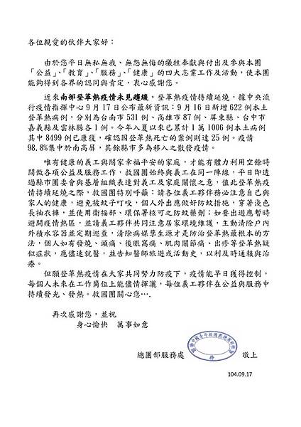 各位親愛的鄉鎮市團委會會長(召集人)及義工們,近日南部登革熱疫情未見趨緩,持續延燒,本團 張主任很關心大家的健康,請大家注意居家環境衛生維護及清除媒蚊孳生源,外出做好防蚊措施避免被蚊子叮咬,有健康的身體才能為社會做更多的奉獻,救國團關心您,也謝謝您平日的付出及奉獻,祝福健康 事事如意。